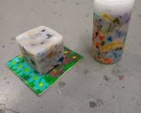 Je maakt een kaars in een mal d.m.v. stukjes gekleurde was te breken. Deze stukjes gaan in een mal en wordt verder vol gegoten met was.