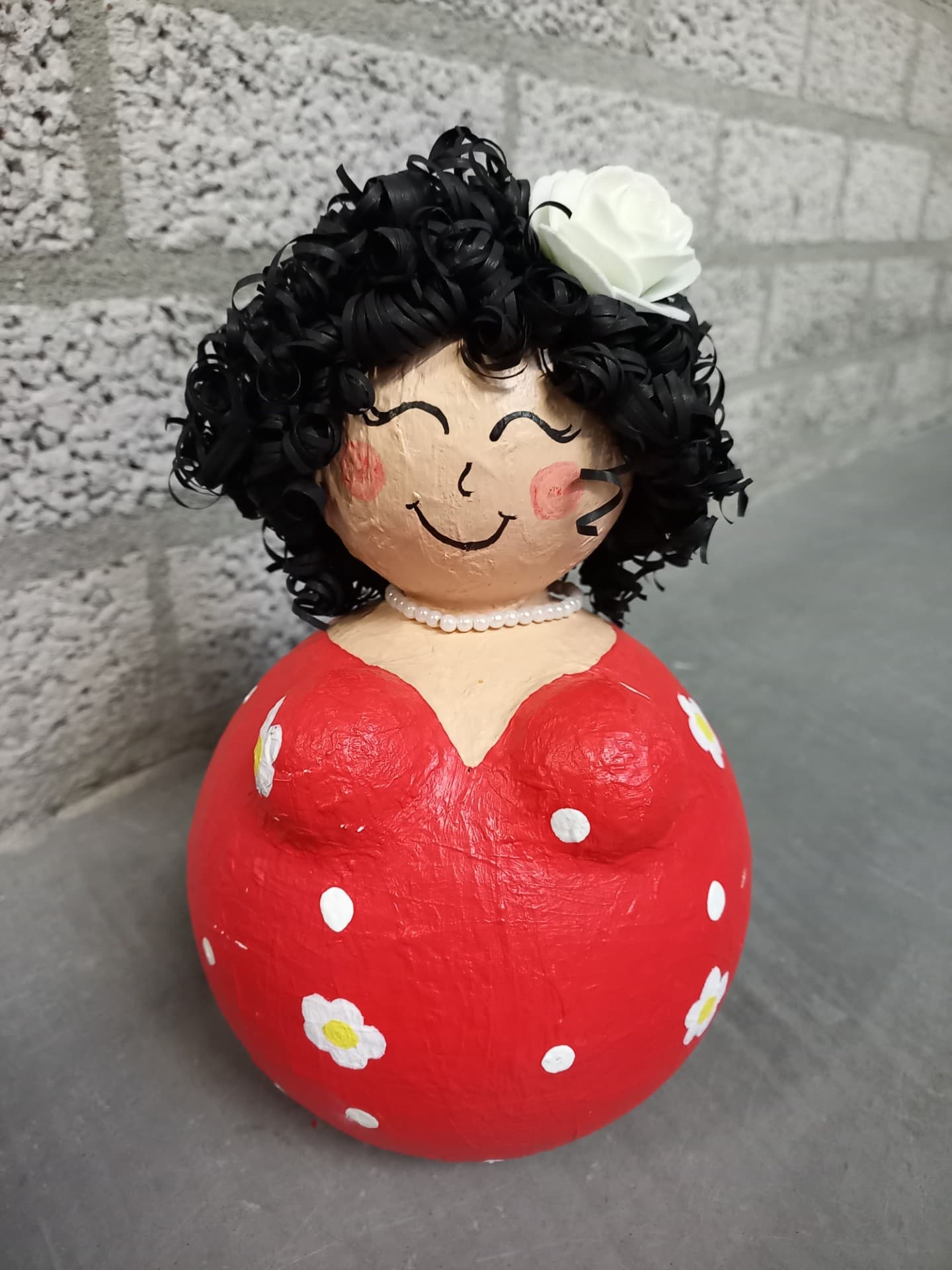 Je beschildert de dikke dame naar eigen inzicht, kan er een bijpassende ketting voor maken en steekt de haren in die al voorgemaakt zijn.