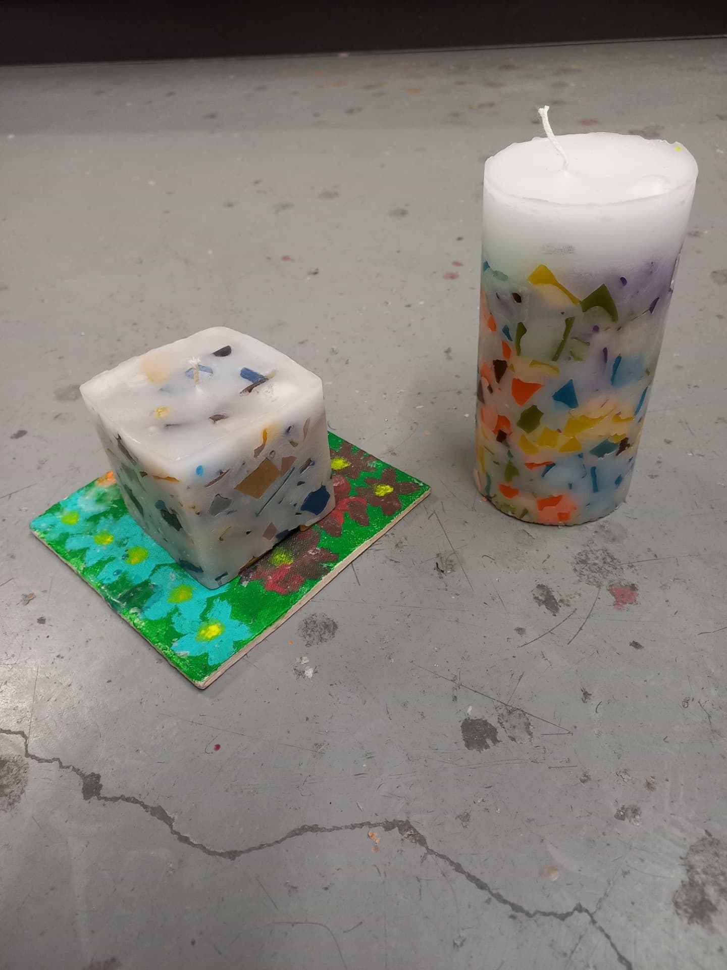 Je maakt een kaars in een mal d.m.v. stukjes gekleurde was te breken. Deze stukjes gaan in een mal en wordt verder vol gegoten met was.